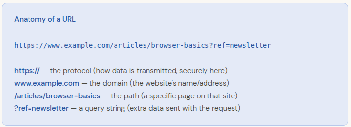 A full URL has several components, though you rarely type all of them out: