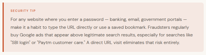 Direct URL entry is faster when you already know where you’re going. It bypasses Google entirely which means no ads, no tracking by a search engine, and no possibility of clicking a fake or phishing result disguised as the site you wanted. Typing www.hdfcbank.com directly into your browser is meaningfully safer than Googling “HDFC bank login” and clicking the first result, which could, in a worst case, be a convincingly designed fake.