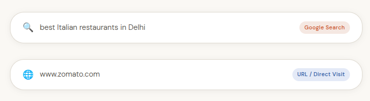 Two inputs, same bar, completely different destinations. In the first example, the browser sends your text to Google (or your default search engine) and brings back a list of results. In the second, it takes you directly to that website no middleman involved.